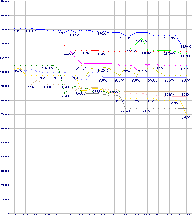 | [↑前グラフ]: | CPU主要製品(最安値3万円~6万円未満)の最安値推移 |