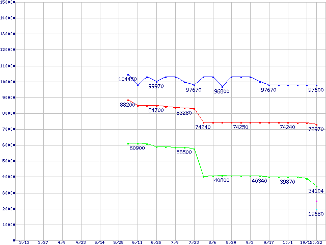 | [↑前グラフ]: | CPU主要製品(最安値6万円以上)の最安値推移 |