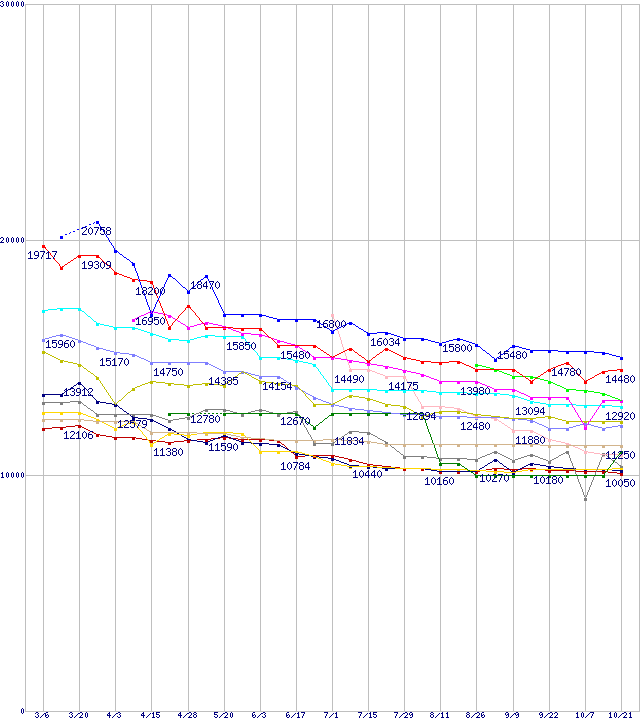 | [↓次グラフ]: | HDD主要製品(最安値1万5千円~2万円未満)の最安値推移 |