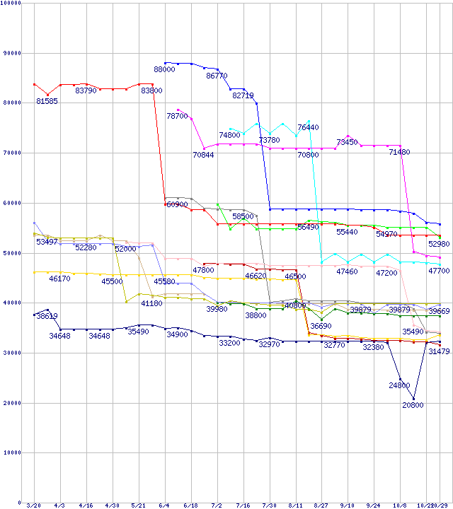 | [↓次グラフ]: | CPU主要製品(最安値6万円以上)の最安値推移 |