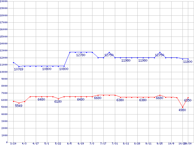 | [↑前グラフ]: | PC3200(DDR400) DDR SDRAM DIMM ECC対応 Registeredタイプの最安値推移 |