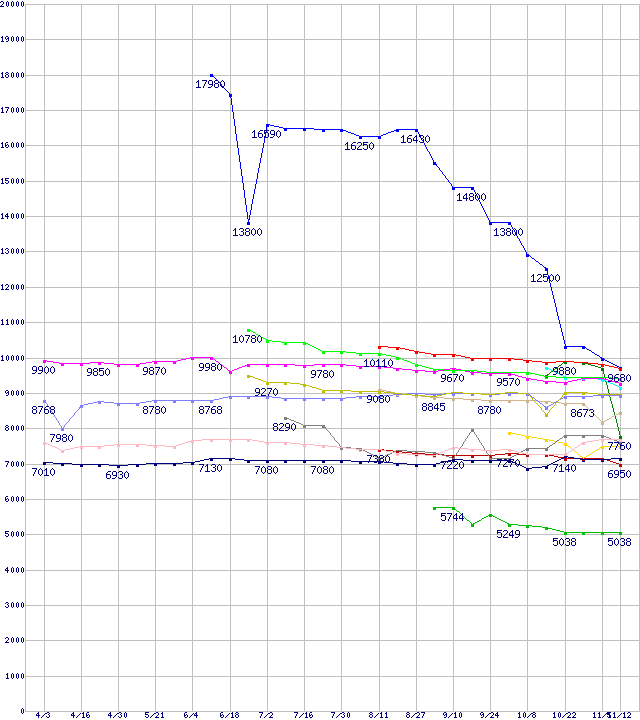 | [↓次グラフ]: | CPU主要製品(最安値1万円~2万円未満)の最安値推移 |