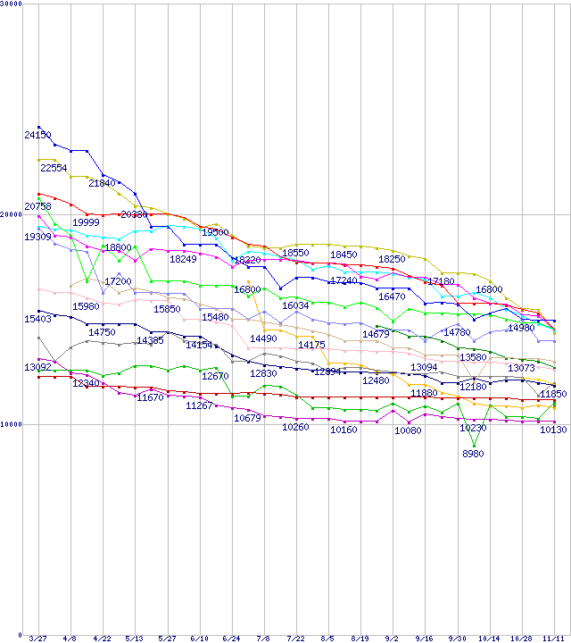 | [↓次グラフ]: | HDD主要製品(最安値1万5千円~2万円未満)の最安値推移 |