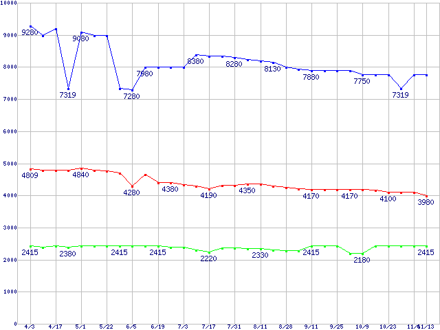 | [↑前グラフ]: | PC2 3200(DDR2 400) DDR2 SDRAM DIMM ECC対応 Registeredタイプの最安値推移 |