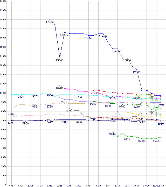 | [↓次グラフ]: | CPU主要製品(最安値1万円~2万円未満)の最安値推移 |