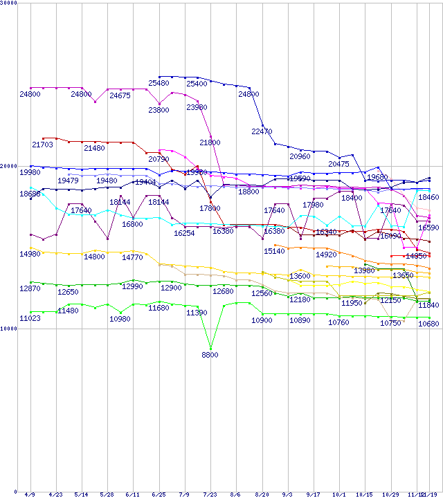 CPU主要製品(最安値1万円~2万円未満)の最安値推移