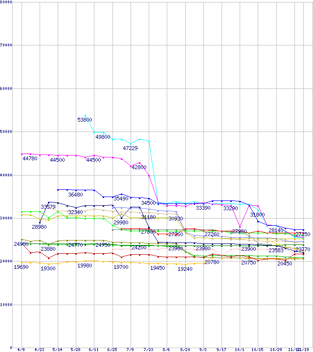 | [↑前グラフ]: | CPU主要製品(最安値1万円~2万円未満)の最安値推移 |
