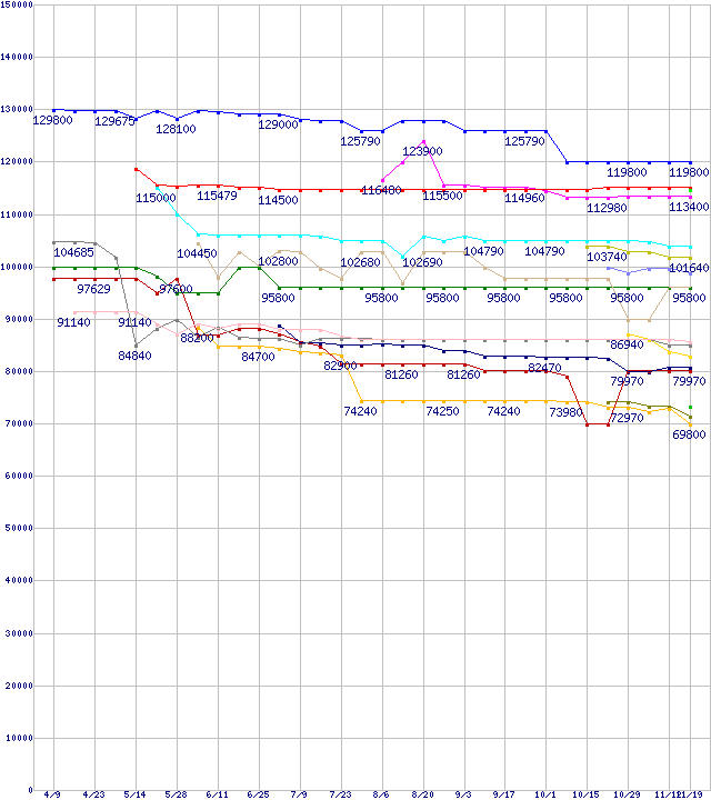 | [↑前グラフ]: | CPU主要製品(最安値3万円~6万円未満)の最安値推移 |