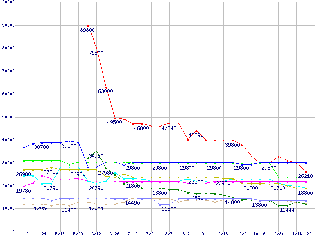 | [↑前グラフ]: | メモリ主要製品(最安値5千円~1万円未満)の最安値推移 |