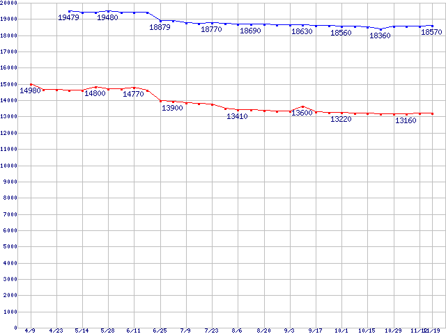 | [↑前グラフ]: | Socket 478 (FC-PGA2,FSB 533MHz,L2 512KB,Hyper-Threading,Northwood)の最安値推移 |