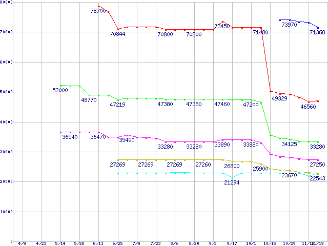 | [↑前グラフ]: | Socket 478 (FC-PGA2,FSB 400MHz,L2 128KB,Northwood)の最安値推移 |