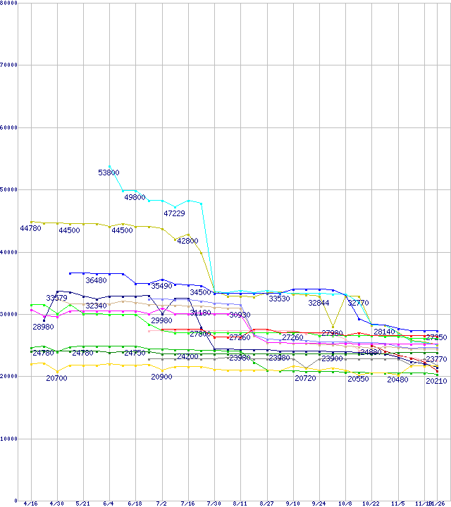 | [↑前グラフ]: | CPU主要製品(最安値1万円~2万円未満)の最安値推移 |