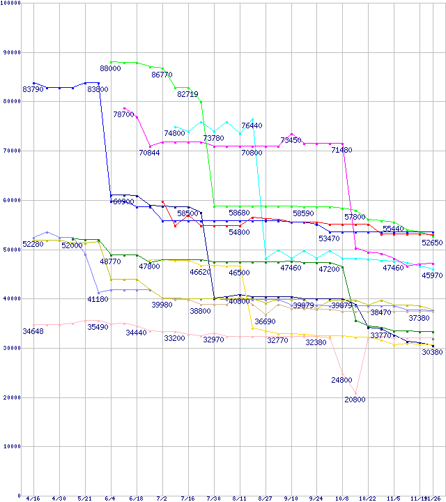 | [↓次グラフ]: | CPU主要製品(最安値6万円以上)の最安値推移 |