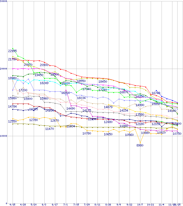 | [↓次グラフ]: | HDD主要製品(最安値1万5千円~2万円未満)の最安値推移 |