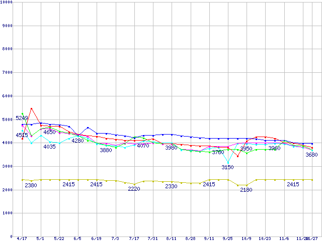 | [↓次グラフ]: | メモリ主要製品(最安値5千円~1万円未満)の最安値推移 |