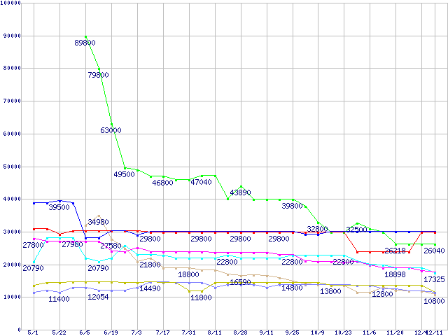 | [↑前グラフ]: | メモリ主要製品(最安値5千円~1万円未満)の最安値推移 |