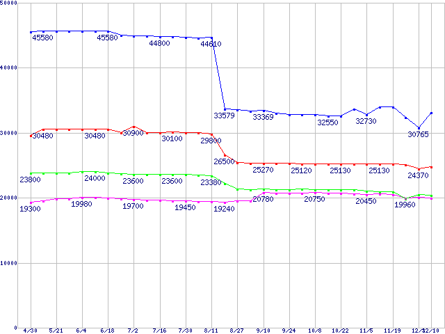 | [↑前グラフ]: | Socket 478 (FC-PGA2,FSB 800MHz,L2 1MB,Hyper-Threading,Prescott)の最安値推移 |