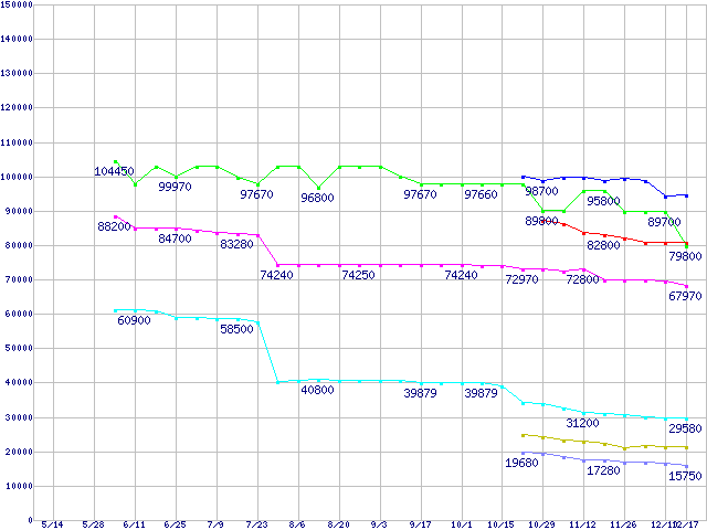 | [↑前グラフ]: | CPU主要製品(最安値6万円以上)の最安値推移 |