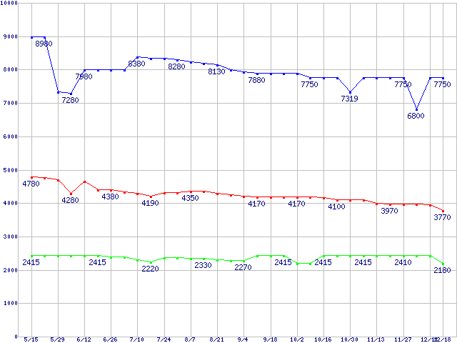 | [↑前グラフ]: | PC2 3200(DDR2 400) DDR2 SDRAM DIMM ECC対応 Registeredタイプの最安値推移 |