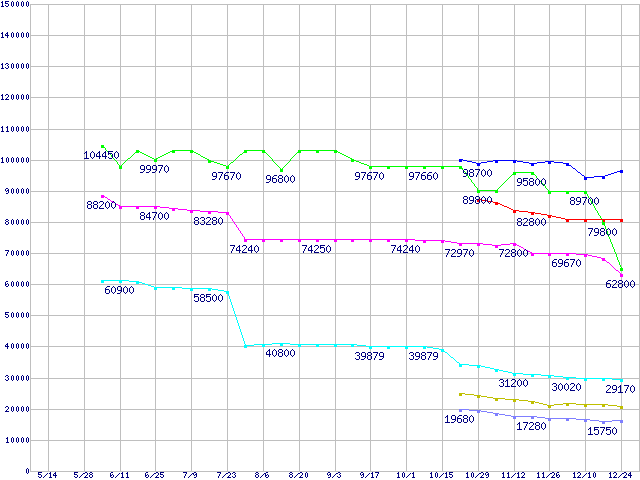 | [↑前グラフ]: | CPU主要製品(最安値6万円以上)の最安値推移 |