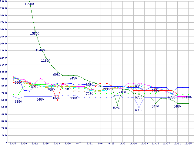 | [↑前グラフ]: | メモリ主要製品(最安値5千円未満)の最安値推移 |