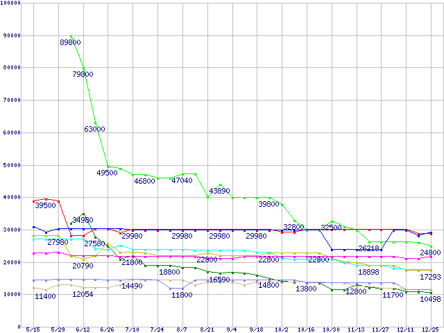 | [↑前グラフ]: | メモリ主要製品(最安値5千円~1万円未満)の最安値推移 |