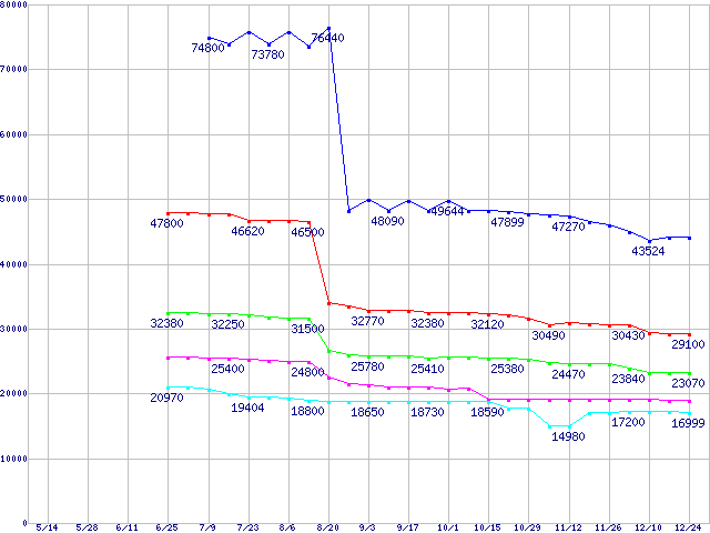 | [↑前グラフ]: | LGA 775 (FC-LGA4 ,FSB 800MHz,L2 1MB,Hyper-Threading,Prescott,NX bit対応,BTX対応)の最安値推移 |