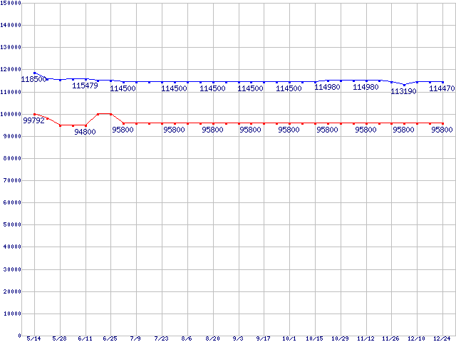 | [↑前グラフ]: | LGA 775 (FC-LGA4 ,FSB 800MHz,L2 1MB,Hyper-Threading,Prescott)の最安値推移 |