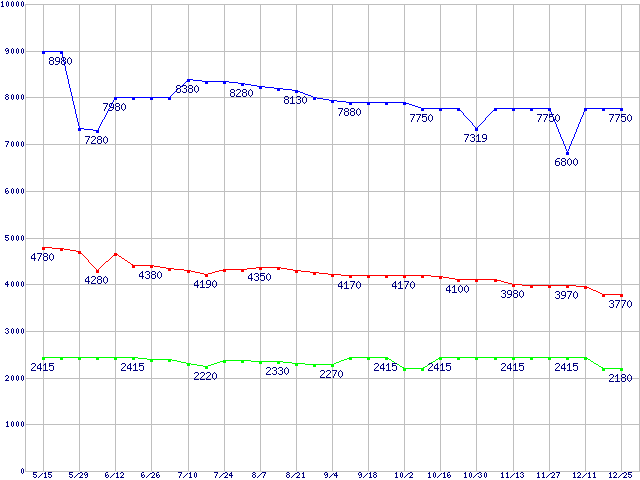 | [↑前グラフ]: | PC2 3200(DDR2 400) DDR2 SDRAM DIMM ECC対応 Registeredタイプの最安値推移 |