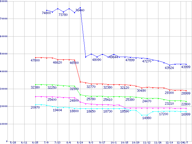 | [↑前グラフ]: | LGA 775 (FC-LGA4 ,FSB 800MHz,L2 1MB,Hyper-Threading,Prescott,NX bit対応,BTX対応)の最安値推移 |