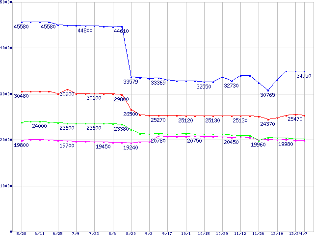 | [↑前グラフ]: | Socket 478 (FC-PGA2,FSB 800MHz,L2 1MB,Hyper-Threading,Prescott)の最安値推移 |