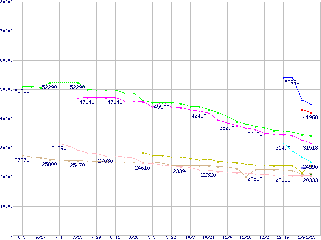 | [↑前グラフ]: | HDD主要製品(最安値1万5千円~2万円未満)の最安値推移 |