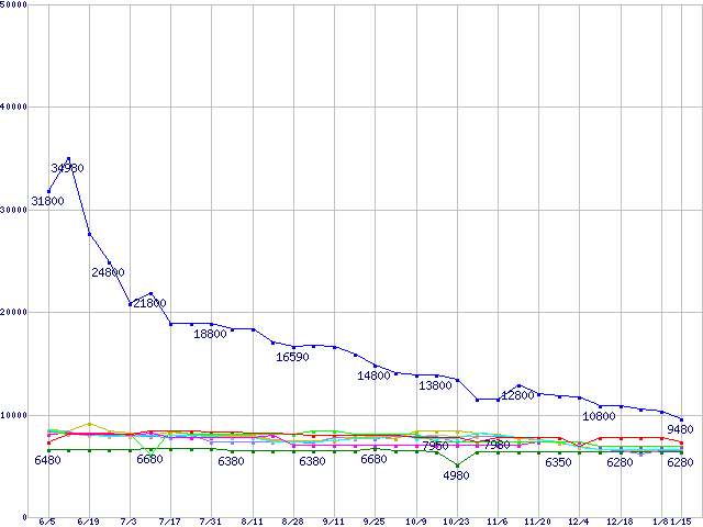 | [↑前グラフ]: | メモリ主要製品(最安値5千円未満)の最安値推移 |