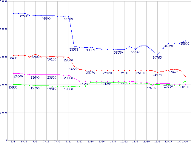 | [↑前グラフ]: | Socket 478 (FC-PGA2,FSB 800MHz,L2 1MB,Hyper-Threading,Prescott)の最安値推移 |
