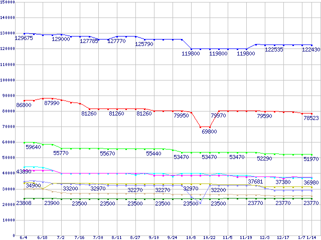 | [↑前グラフ]: | Socket 604 (FCBGA,FSB 800MHz,L2 1MB,Nocona)の最安値推移 |