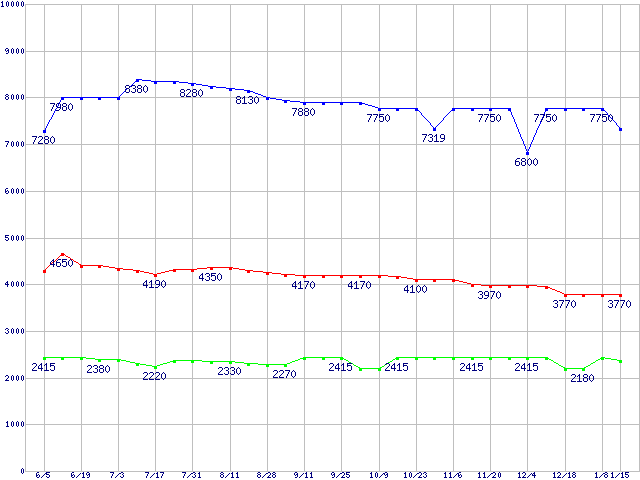 | [↑前グラフ]: | PC2 3200(DDR2 400) DDR2 SDRAM DIMM ECC対応 Registeredタイプの最安値推移 |