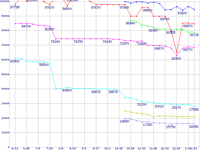 | [↑前グラフ]: | CPU主要製品(最安値6万円以上)の最安値推移 |