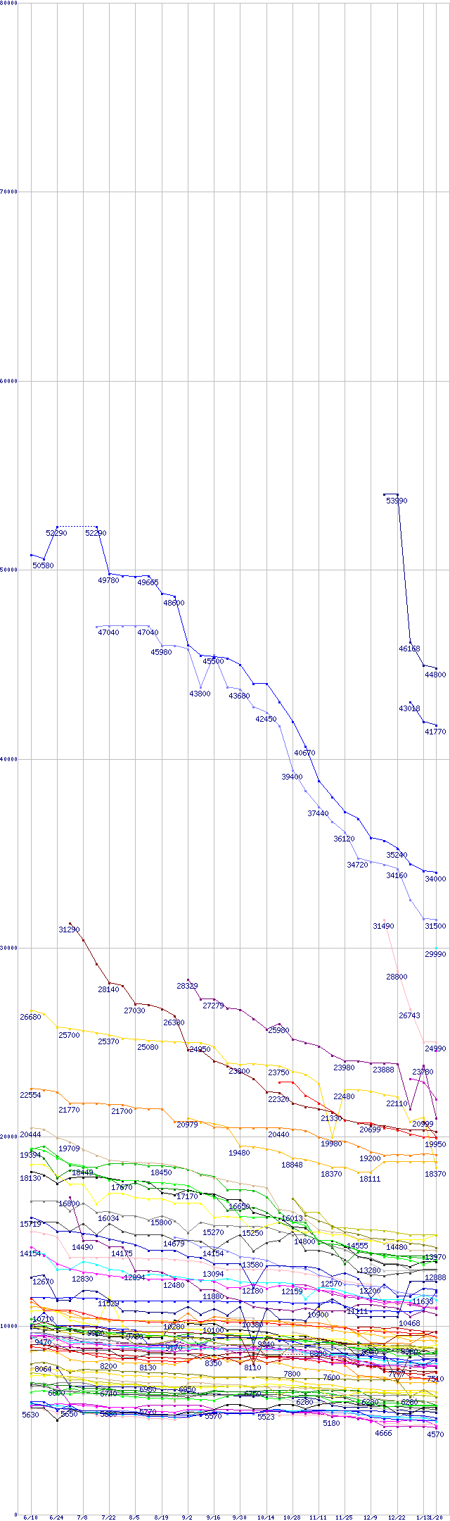 [前グラフ]:HDD主要製品(最安値2万円以上)の最安値推移