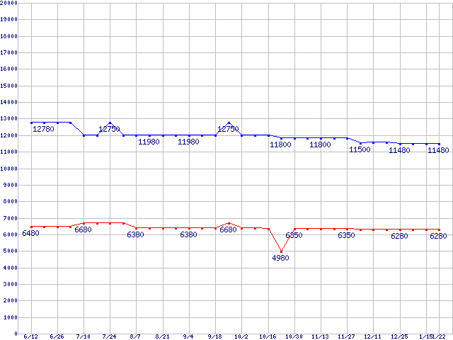 | PC4000(DDR500) DDR SDRAM DIMMの最安値推移 |