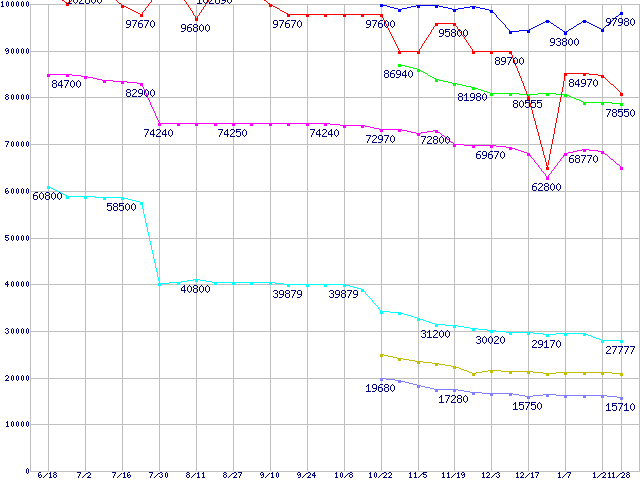 | [↑前グラフ]: | CPU主要製品(最安値6万円以上)の最安値推移 |