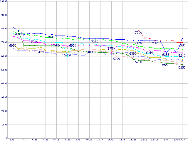 | [↑前グラフ]: | HDD 30GB~80GB未満の最安値推移 |
