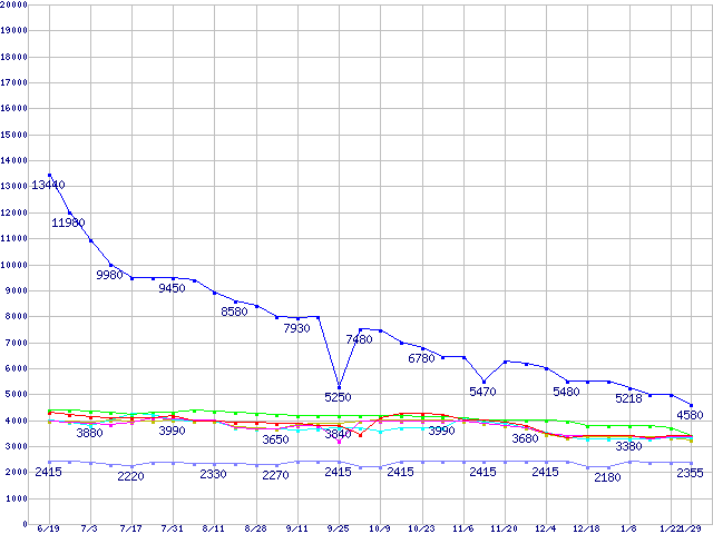 | [↓次グラフ]: | メモリ主要製品(最安値5千円~1万円未満)の最安値推移 |