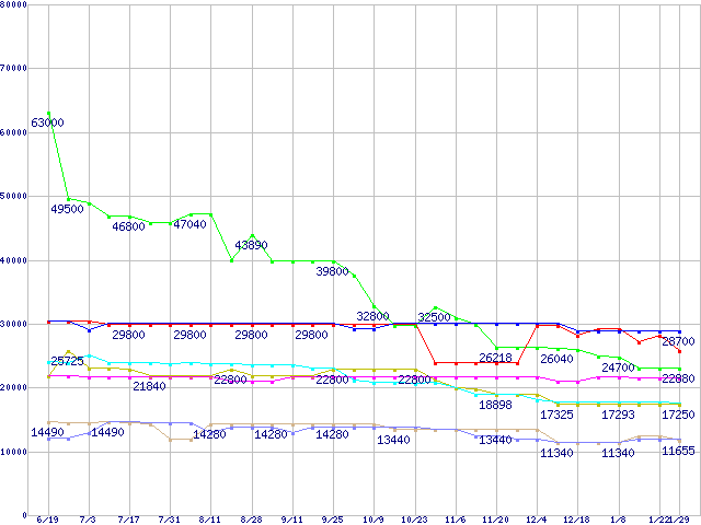 | [↑前グラフ]: | メモリ主要製品(最安値5千円~1万円未満)の最安値推移 |