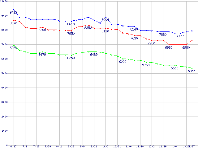 | [↑前グラフ]: | MaXLine II (5400rpm,Ultra ATA/133,2MB,80GB/Platter,BB)の最安値推移 |
