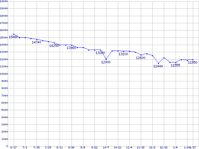 | [↑前グラフ]: | Barracuda 7200.7 SATA (7200rpm,Serial ATA,NCQ,8MB,80GB/Platter,FDB)の最安値推移 |