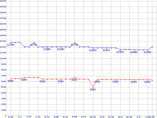 | PC4000(DDR500) DDR SDRAM DIMMの最安値推移 |