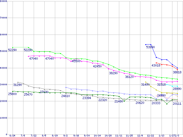| [↑前グラフ]: | HDD主要製品(最安値1万5千円~2万円未満)の最安値推移 |