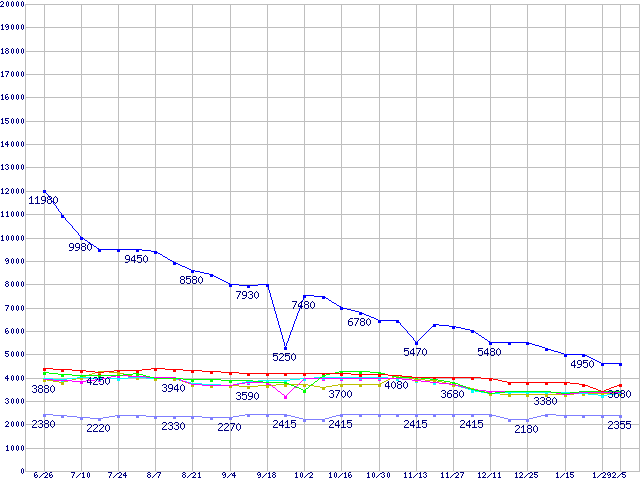 | [↓次グラフ]: | メモリ主要製品(最安値5千円~1万円未満)の最安値推移 |