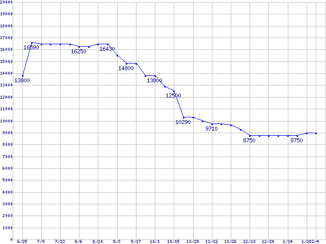 | mPGA479M (Micro-FCPGA ,FSB 400MHz,L2 512KB,Banias)の最安値推移 |