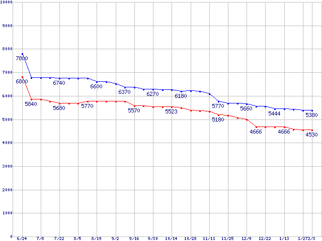 | [↑前グラフ]: | Deskstar 7K250 (7200rpm,Ultra ATA/100,FDB)の最安値推移 |
